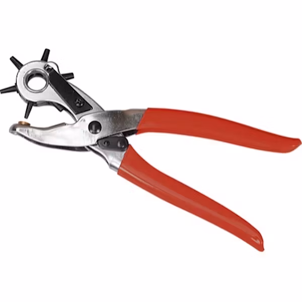 Handhållen håltång i metall med greppvänligt handtag. Optimal för håltagning i träns, stigläder, grimmor eller andra läderartiklar.