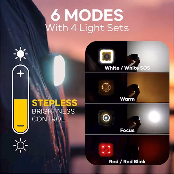 Eftersom situationer och behov varierar kan man välja mellan sex olika ljuslägen. Vitt dagsljus, varmt ljus, fokuserad stråle, blinkande rött ljus och SOS-läge. Ljusstyrkan kan dessutom regleras steglöst från 1–100%. I kombination med en ljusspridning på 120 grader skapar detta en säker och bekväm miljö att arbeta i.