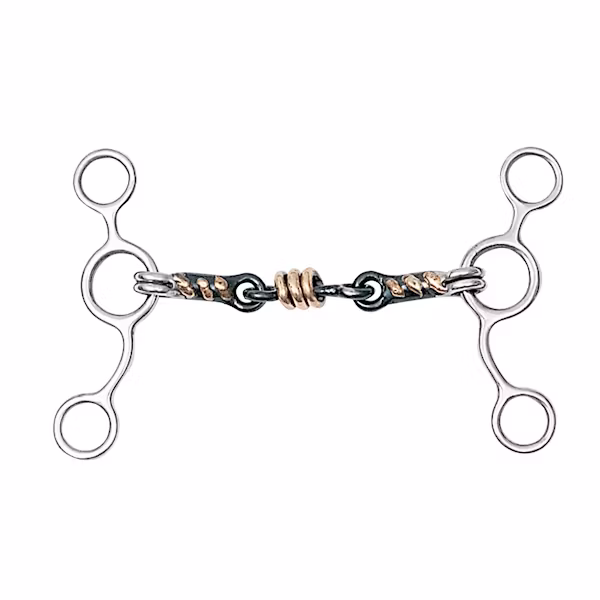 Sweet iron bett ifrån Three Horses. 3-delat bett. Mittendelen med kopparrullar har en lugnande effekt på vissa hästar.