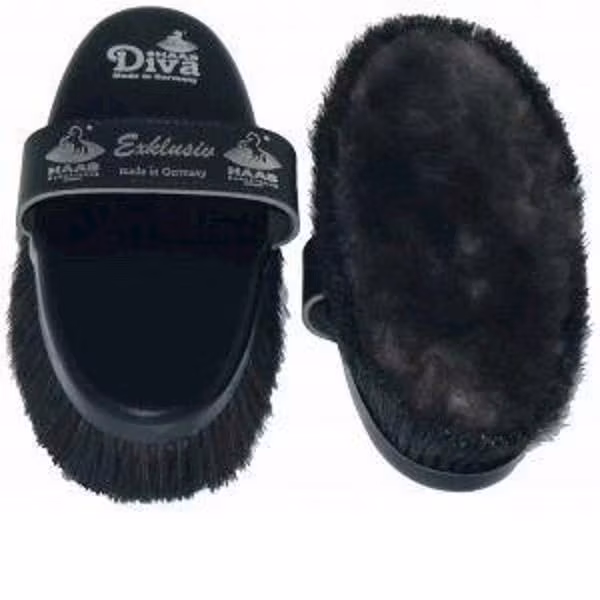 Diva Exclusive Borsten är av lammull i mitt och lite högre hästhår runtom. Denna supermjuk finish borsten är perfekt för att ta bort fina dammpartiklar, för att skapa en otroligt glänsande päls. Svart, med en läder handrem.