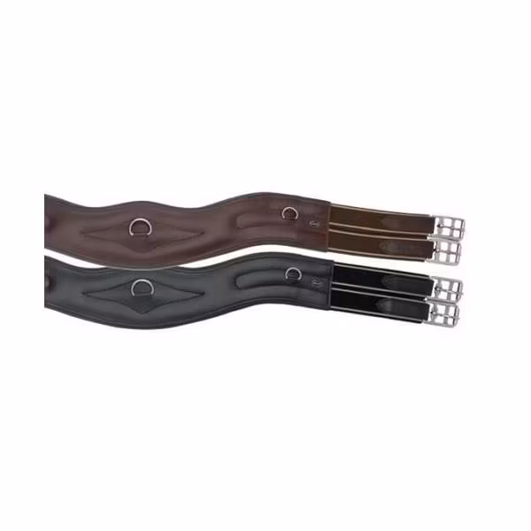 Anatomisk utformad sadelgjord helt i läder. 3-dubbel resår i båda ändarna. Rostfria spännen, rullsöljor.