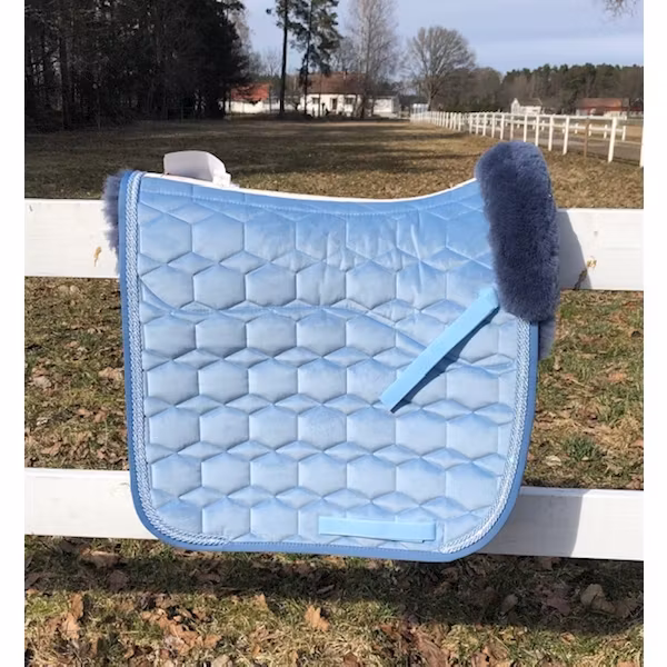 Vackert sammetsschabrak från EA Mattes i färgen Cornet Blue. Storlek L.Sammetsschabraket har en integrerad fårskinnspad med fram och bakkant, plus en dekorativ
