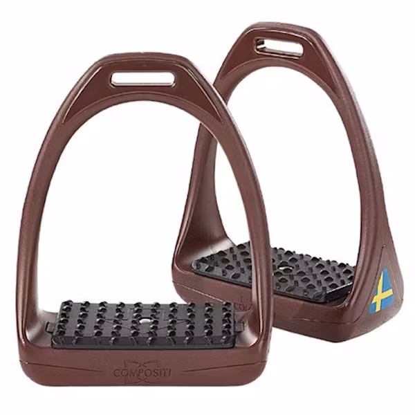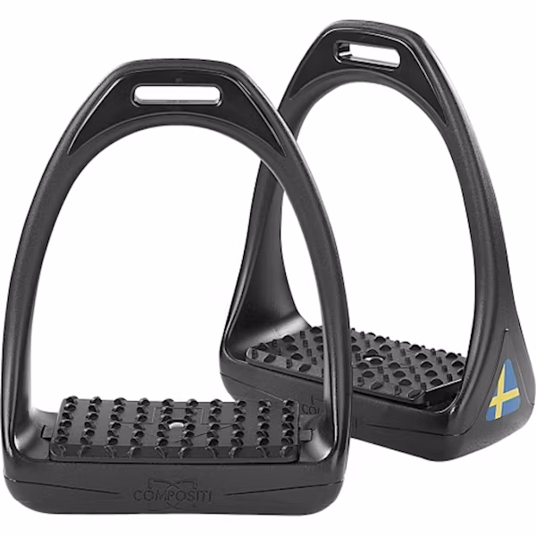 Compositi lättviktsstigbygel. En stigbygel i mycket starkt plastmaterial. Extra bred och grovräfflad fotplatta för bästa tänkbara fäste. Bredd 64 mm. Bygeln har stötdämpande lager som flexar och är skonsamt mot både knän och vrister.