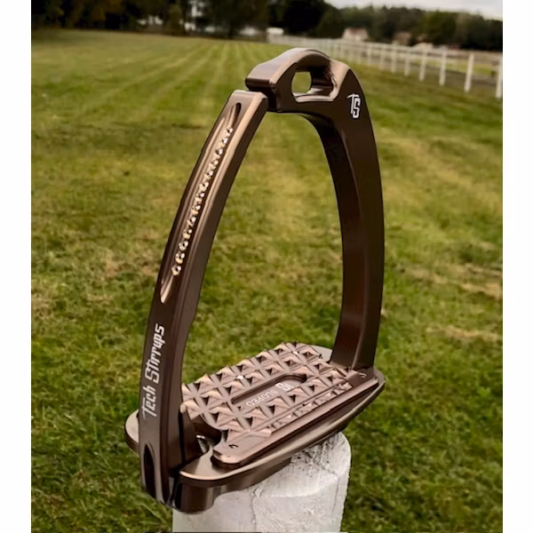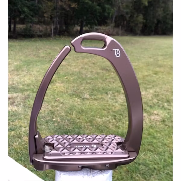 En säkerhetsstigbygel i lutande modell (2,5°) som hjälper dig hålla ner hälarna i stigbygeln. Finns i 4 olika färgkombinationer.