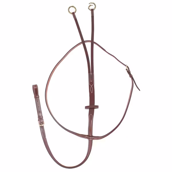 Elegant martingal i exklusivt italienskt läder med vita sömmar och brun/mässingspännen och svart/silverspännen. Smarta öppningsbara mässingsringar för snabb och enkel hopsättning med tyglar. Lyxig E-logga som pricken över i:et.