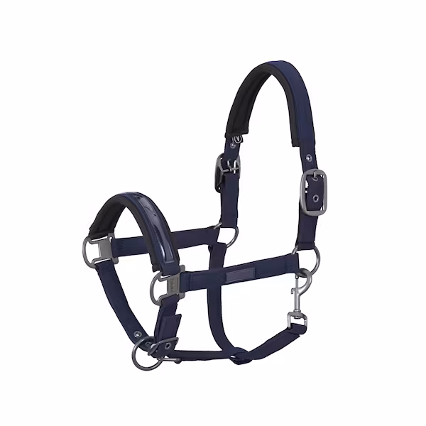 Mjuk och skön grimma i nylon med glossy-material på utsidan.Justerbar över nacken med spännen på båda sidor samt runt nosen med ett spänne.Mjukt vadderad över n
