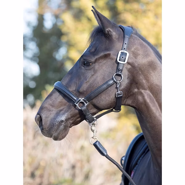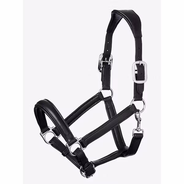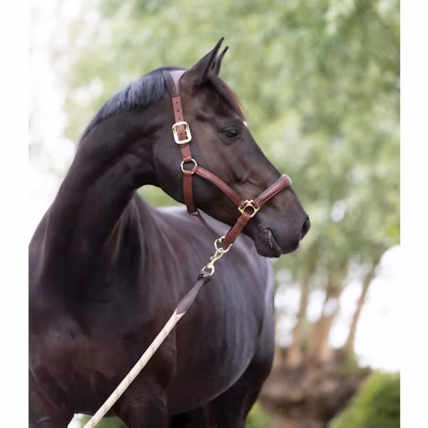 Vackert utformade vadderade lädergrimma har ett anatomiskt formad huvudstycke och nosrem som ger full komfort till hästen. De solida metallbeslagen, vadderad lä