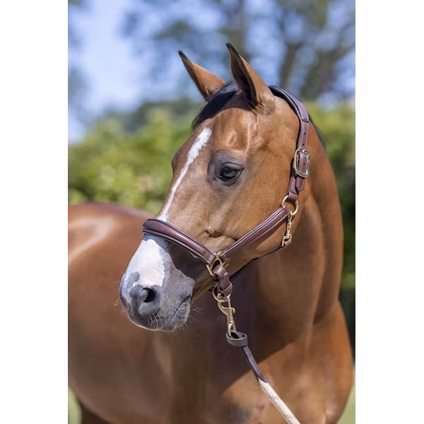 Vackert utformade vadderade lädergrimma har ett anatomiskt formad huvudstycke och nosrem som ger full komfort till hästen. De solida metallbeslagen, vadderad läderkehlriemen och kindstyckena ger denna klassiska grimma en lyxig stil.