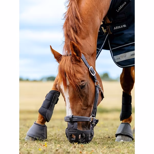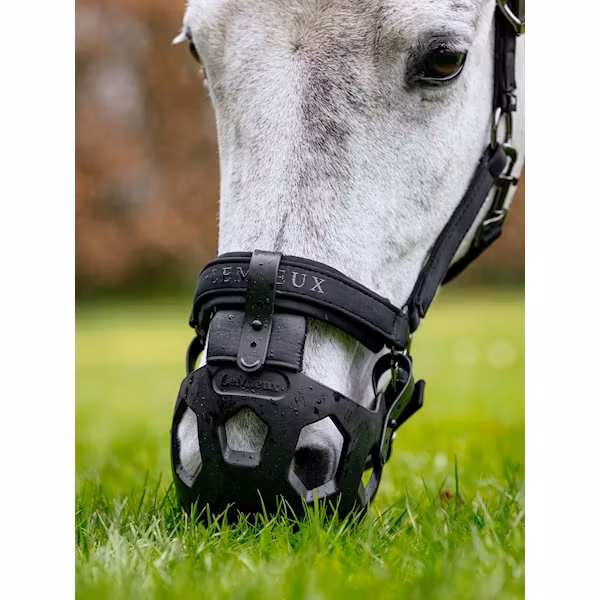 Vår smarta betesreducerare utvecklad och baserat på forskning och innovation, begränsar överdriven betning samtidigt som den låter hästen dricka och andas lätt. Kompatibel med de flesta vanliga grimmor och utrustad med starka inbyggda justerbara stängningar, så att du kan anpassa den helt. Placeringen av foder hålet är noggrant utformad för att minska belastningen på hästens käke, medan den lätta, ergonomiska och icke-slitande designen möjliggör naturlig rörelse. Tillverkad av veganska material för ett naturligt utseende.