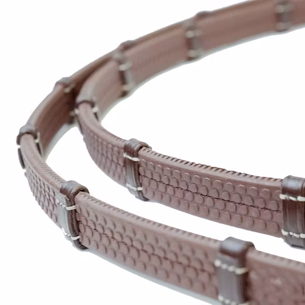 Tyglarna har ett grepp i brunt gummi och en elegant brodyr på läderdelen. Stopp för martingalringar i läder och snabbspännen med inåtvända krokar. Spännen i rostfritt stål.