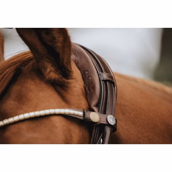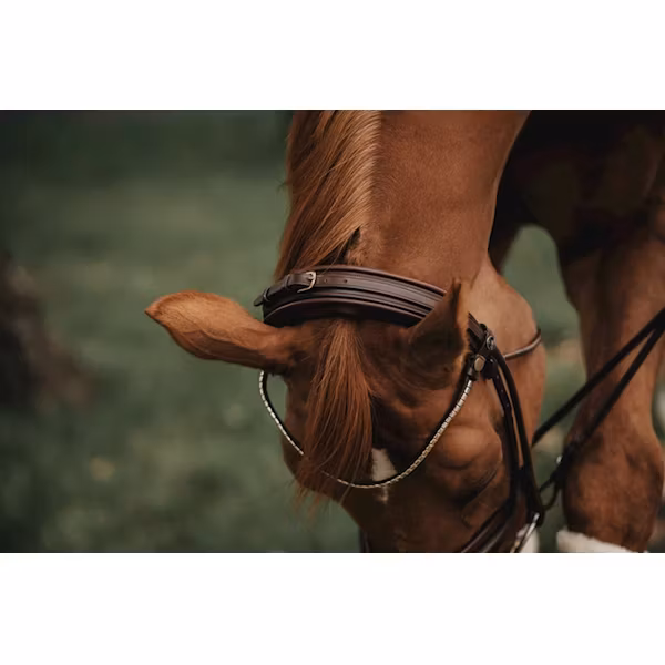 Ett anatomiskt och rundsytt träns i mjukt amerikanskt läder med ett unikt nackstycke som förebygger tryck- och muskelskador i hästens nacke och halsmuskulatur. Tränset är försett med ett tunt pannband med snygg clinker i silver det finns även pannband med swarovski stenar att köpa separat i märket Finesse.