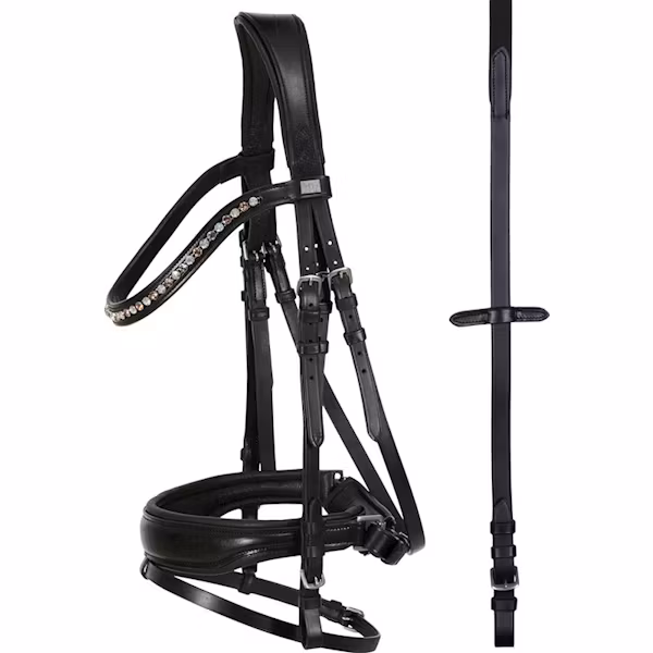 Horse Guard träns med pull-back knäppning.Vadderad nosgrimma med avtagbar snokrem. Böjt pannband med silver stenar.Anatomiskt nackstycke med mjuk fodring för pe