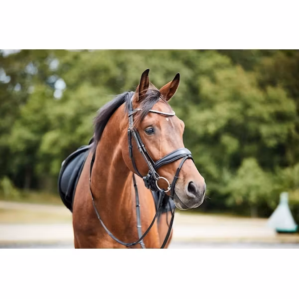 Horse Guard träns med pull-back knäppning.Vadderad nosgrimma med avtagbar snokrem. Böjt pannband med silver stenar.Anatomiskt nackstycke med mjuk fodring för pe