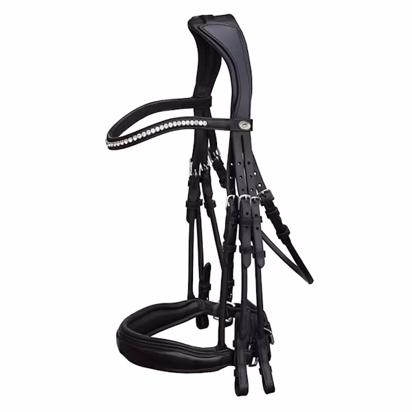 Anatomiskt utformat, rundsytt och mycket prisvärt kandar från märket Schockemöhle Sports. Kandaret har en nosgrimma och ett nackstycke som är ergonomiska. Nosgrimman på Venice är extra bred med avsmalnande böjda sidor för att frilägga kindbenet och minska risken för nypskador mellan bett och nosgrimma, den stängs med pullback. Nackstycket är mycket mjukt med endast en smal sammanlänkning för sidostyckena, paddningens form frilägger öronen och minskar risken för tryck mot atlas. Käkremmen har spännen på båda sidor.Vackert pannband med stora glittriga kristaller i en rad, som är något böjd, vilket gör att det ligger snyggt på hästen.OBS! Tyglar ingår ej.