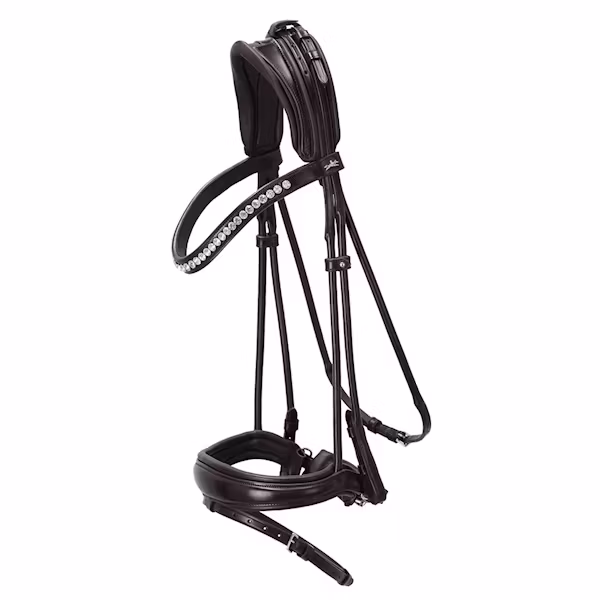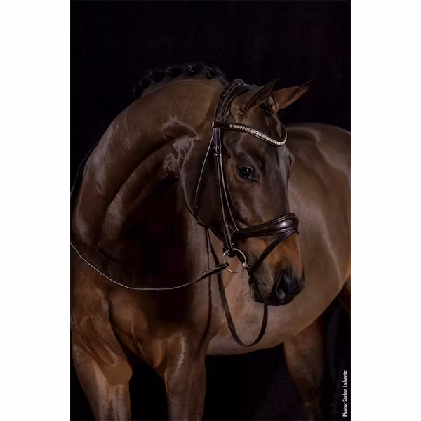 Ett Snyggt rundsytt träns från Schockemöhle.Tränset är designat med ett mjukt, vadderat nackstycke där spännen för att justera storlek lagts på nackstycket för