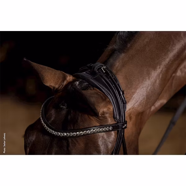 Tränset är designat med ett mjukt, vadderat nackstycke där spännen för att justera storlek lagts på nackstycket för att få bort dem från hästens huvud.