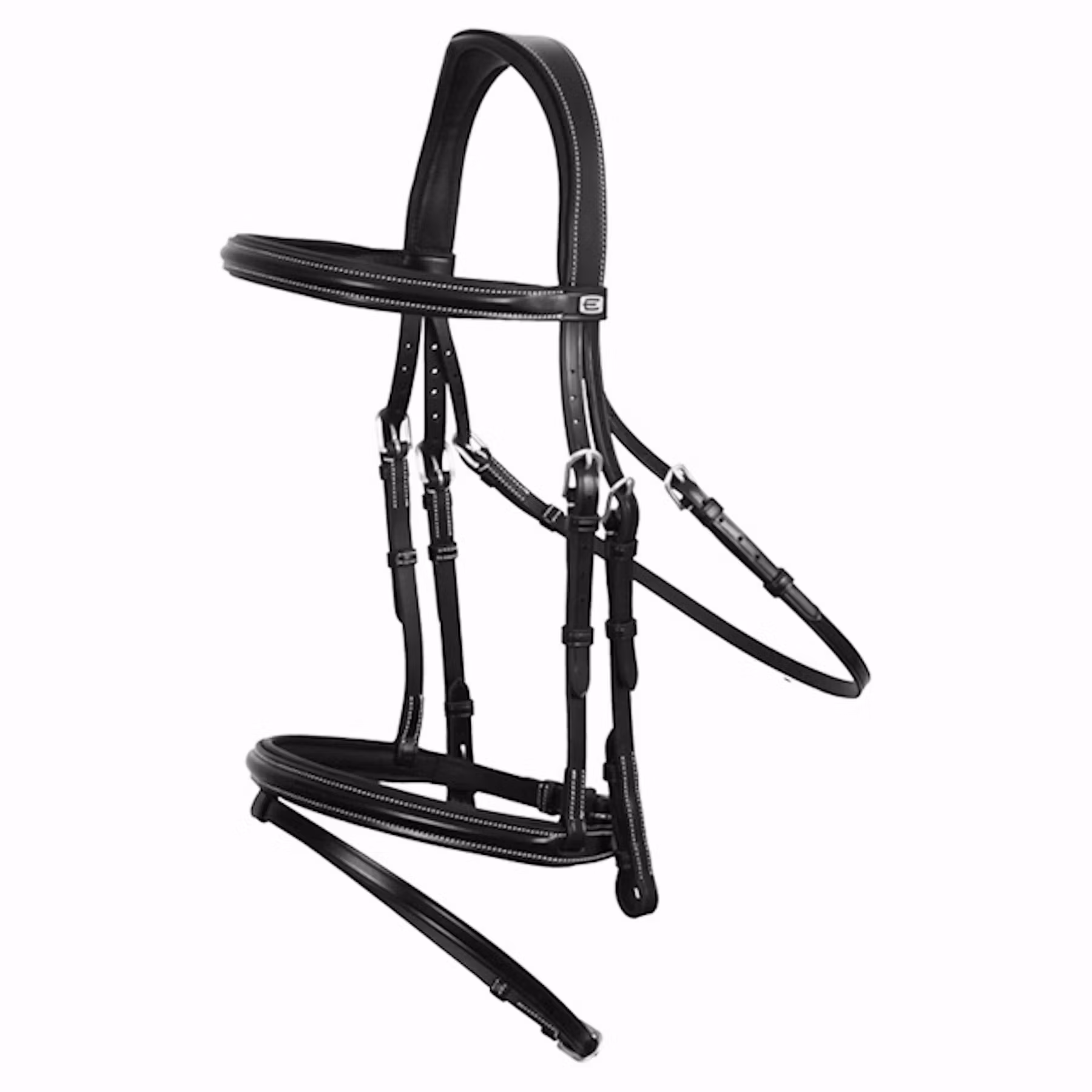 Elegant träns i italienskt läder med stilrena vita sömmar, mässingspännen, klassiskt pannband och kombinerad paddad nosgrimma.