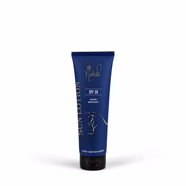 Nathalie Sun Lotion SPF 30 är en vattenavvisande och mycket dryg sollotion. Speciellt framtagen till hästar som går på gräs. Den är mycket robust och sitter kvar länge när hästen betar.