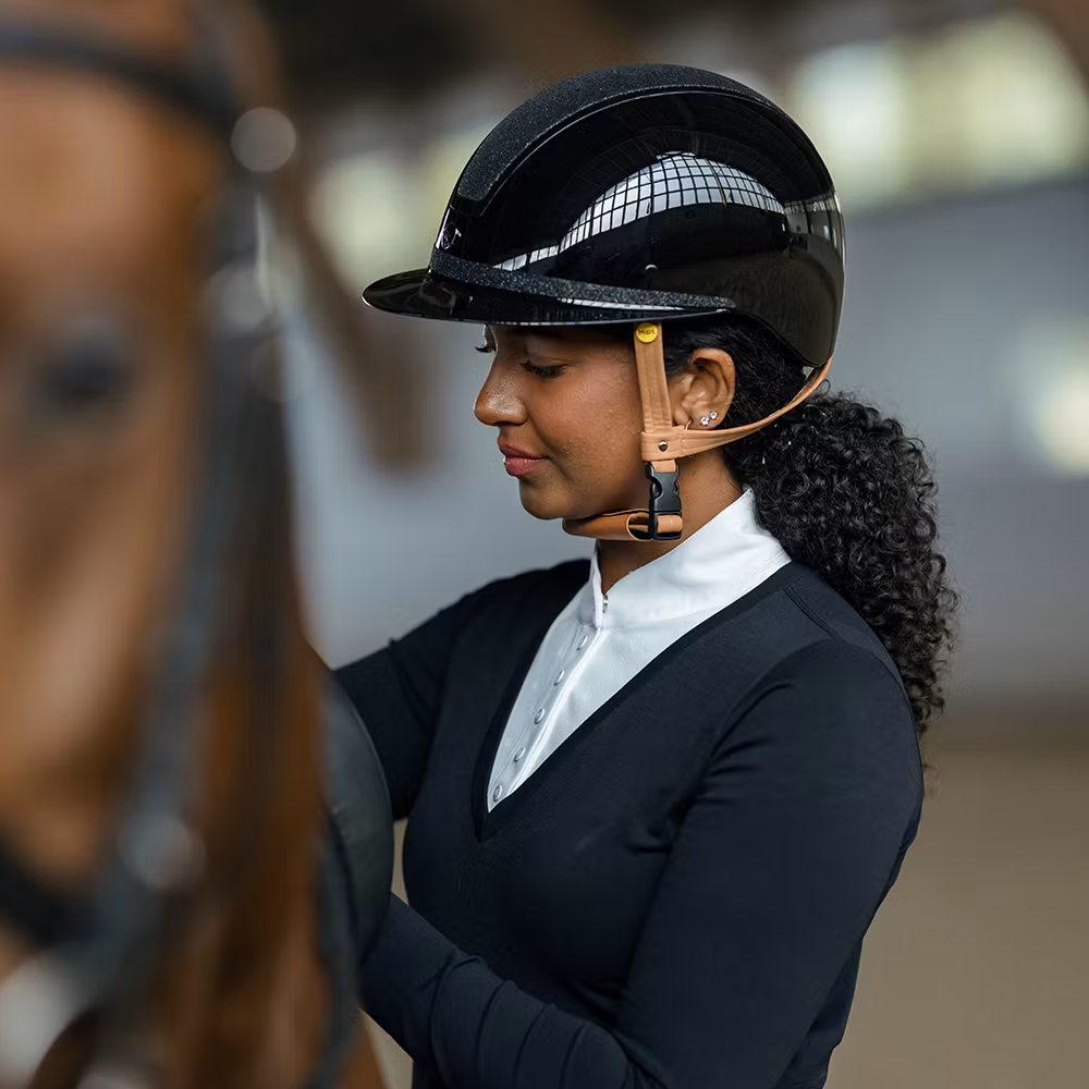 Ridhjälm med implementerat Mips-system. Elegant snygg glansig hjälm med bred solskärm och gnistrande glittrande panel samt vackert glitterband runt skärmen. Designad med totalt sex ventilationsöppningar. Justerbart hakband i exklusivt brunt konstläder med trepunktsfästen samt snabbspänne. För optimal passform justeras storleken enkelt baktill med hjälp av rattsystemet. Avtagbart innerfoder av Cooldry-material, som torkar snabbt och håller huvudet svalt. Tillverkad av premium polykarbonat.