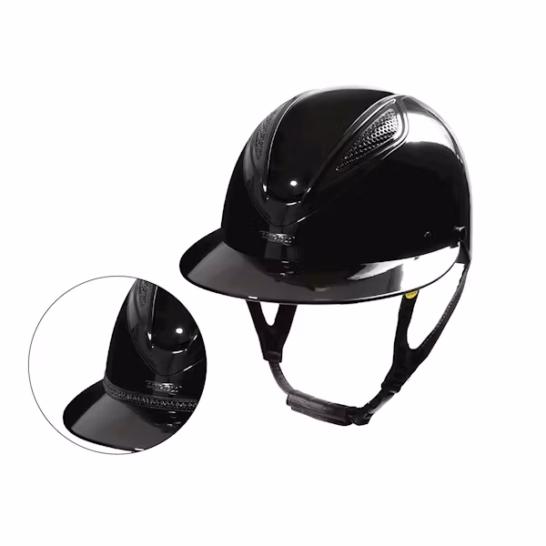 Svart glossy ridhjälm med MIPS solskärm – Lami-Cell Alice erbjuder en perfekt balans mellan stil, komfort och skydd, vilket gör den till ett utmärkt val för ryttare på alla nivåer. En lättviktshjälm med implementerat Mips-system. Utsida av “Impact-resistant” ABS material. Innerskal av stötdämpande Expanded Polysterene (EPS) foam. Skärm: PA- Polyamid TECAMID Vikt: 590g (+-30g) Liner: Avtagbar i cool-dry mesh Hakrem: Eco-läder med 4-punktspänne För optimal passform justeras storleken enkelt baktill med hjälp av rattsystemet och det justerbara hakbandet. Avtagbar dekor-strap medföljer. GODKÄND ENLIGT STANDARD CE EN1384-2023 Storlek: S/M:52-56 cm, M/L:56-59 cm