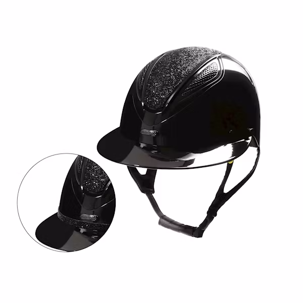 Svart glossy ridhjälm med MIPS, glitter-topp och solskärm – Lami-Cell Amelia MIPS erbjuder en perfekt balans mellan stil, komfort och skydd, vilket gör den till