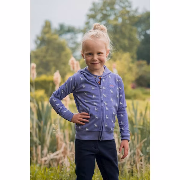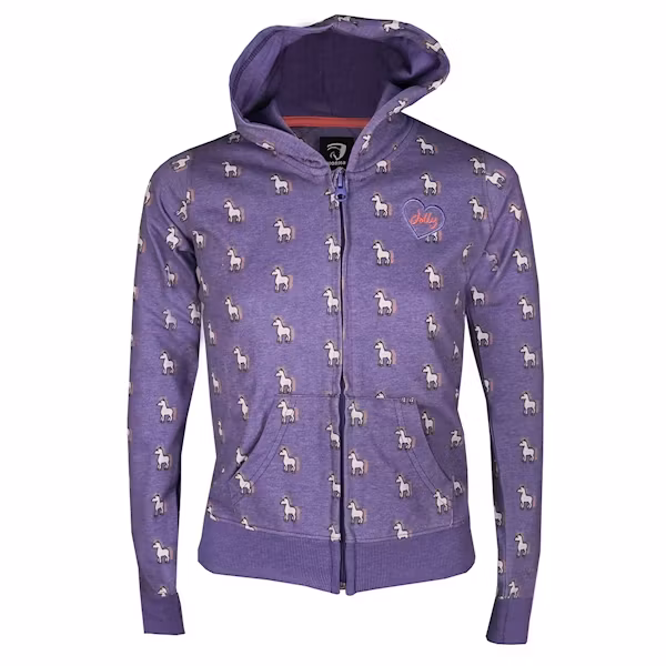 Bedårande jacka för barn med trendigt utseendeglatt all-over Jolly-tryckfastsatt huvafickor på framsidanribbväv vid ärmslut och fållmed Jolly-text i ett hjärta