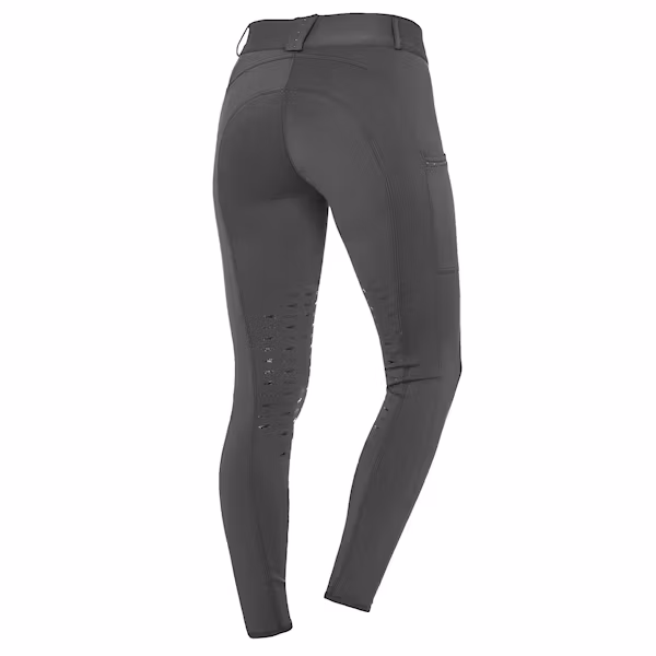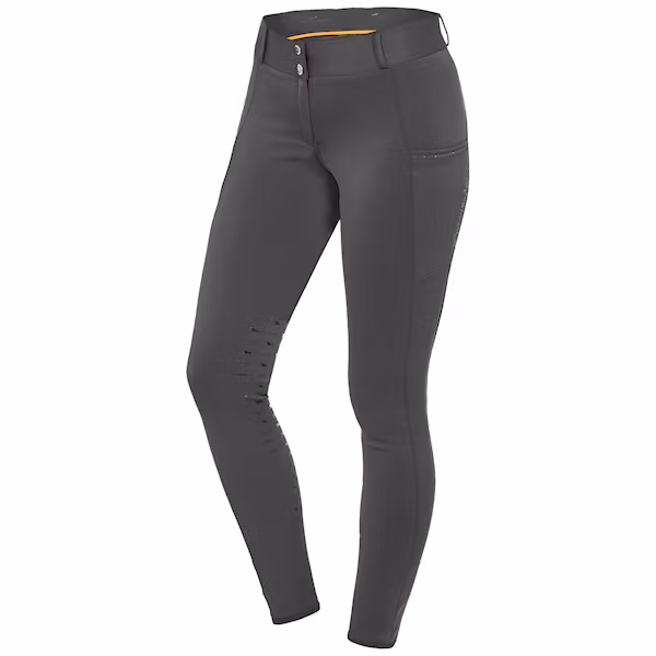 Ridbyxor med bred linning, strassdekoration, mobilficka på sidan och öglor för bältet. Ridbyxa Clara är helskodda med silikon-print.