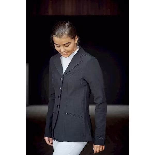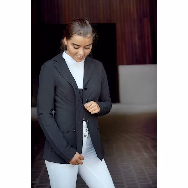 Eleganta detaljer och lättviktstyg ger denna fantastiska tävlingskavaj en proper look och härlig känsla. Det mjuka tekniska tyget är extremt lätt, har andasfunktion och ser fantastiskt ut hela tävlingsdagen. Blixtlås som är dold bakom frontknapparna för en mjuk och fin look. De fyra frontknapparna döljer blixtlåset och passformen är välsittande och bekväm. Sneda framfickor och sprund bak gör en slank look. Kragen är utformad för komfort och en fräsch look. Du kommer att synas inne på tävlingsbanan med denna vackra tävlingskavaj.