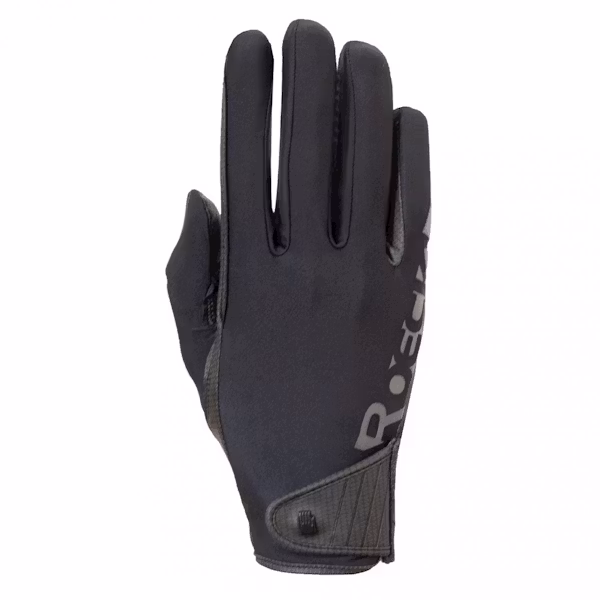 Roeckl ridhandske är en snygg lätt handske i svart med en grå Roeckl logga på handryggen.