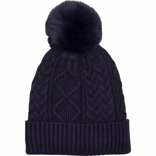 Kabelstickad hatt med avtagbar pompon. Liten Equipage -logotyp flagtag. Mjukt foder i polarfleece.