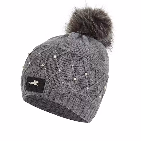 Mössan är stickad med strass och pärldekoration, en vacker faux fur pälsboll och fleecefoder.En snygg mössa som passar lika bra i stallet som på stan.Färg Grey