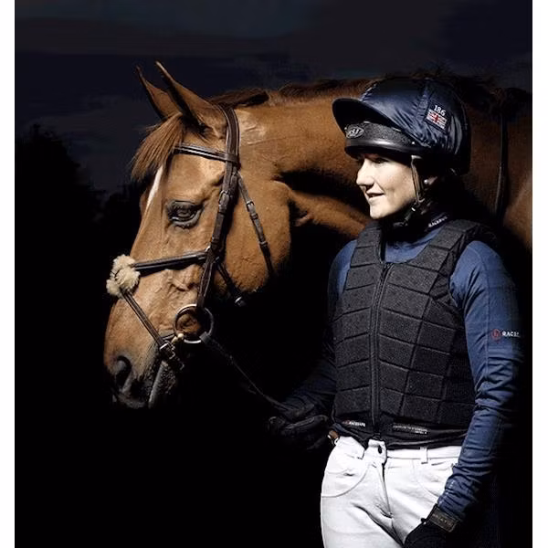 Säkerhetsväst Racesafe godkänd enl EN 13158:2009 klass 3. Säkerhetsvästen har snörning i sidorna för att kunna justeras till midja och bröstkorg. Skumpanelerna måste mötas eller överlappa för att upprätthålla det skydd som krävs.