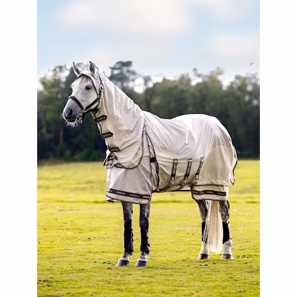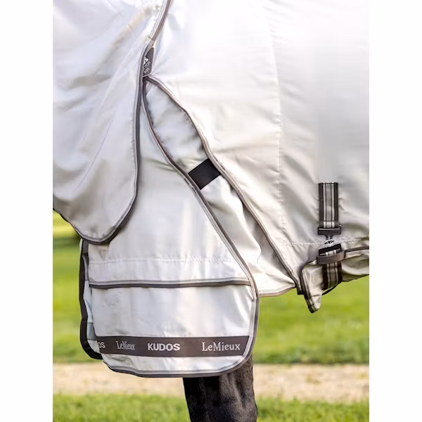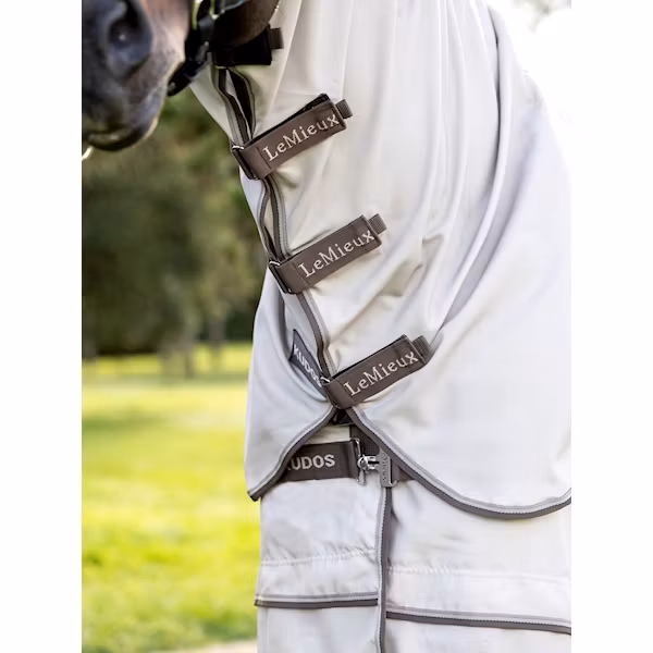 LeMieux Flugtäcke Shower Pro Sweet Itch Kudos Stone är ett avancerat flugtäcke för häst, utvecklat för att ge maximalt skydd mot knott och insekter – även i reg