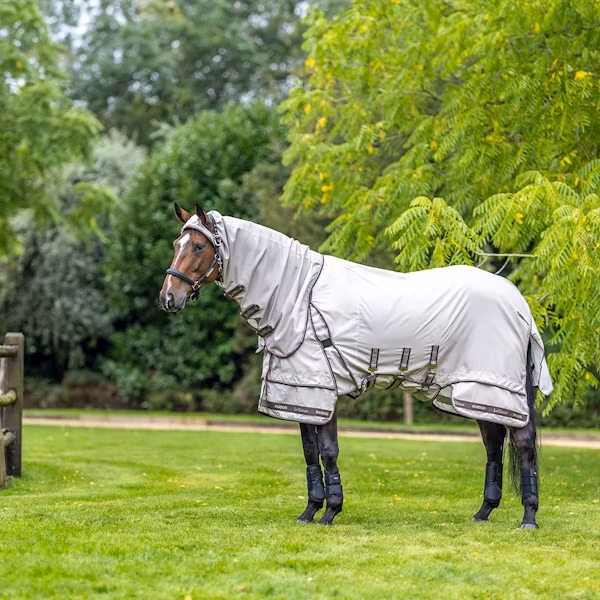 Den heltäckande halsen med öronhål, fodrad man och extra lång svanslapp försvarar hästens mest känsliga områden.