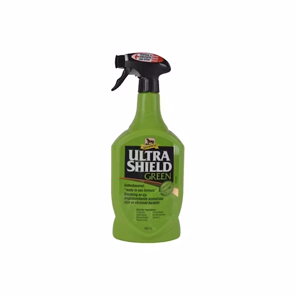 Naturlig vattenbaserad sommarspray som innehåller väldoftande eteriska oljor med avvisande och vårdande egenskaper. Framtaget för att ge en trivsam, lugn och behaglig utevistelse eller ridtur under sommarmånaderna. Har vårdande egenskaper som ger en skinande päls, man och svans. Lämnar inga klibbiga eller oljiga rester. UltraShield Green fungerar utmärkt att använda på hästar, boskap och husdjur. 0h tävlingskarens! (innehåller ej längre cederträolja)