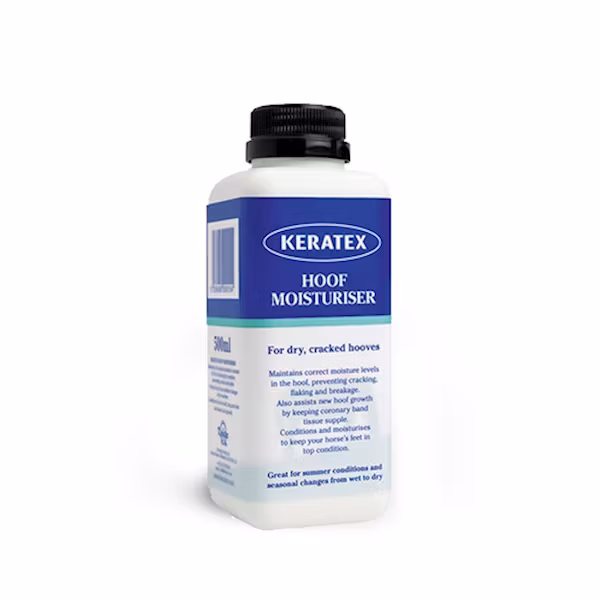 Denna produkt är speciellt utformad för att ta itu med uttorkade och spröda hovar för att återställa dess naturlig hälsa och vitalitet. Keratex Hoof Moisturizer har en "intelligent"’ formel, som fungerar genom att återställa de korrekta fuktnivåerna på insidan av hoven och bibehålla denna nivå för optimalt hovskick. Produkten förhindrar, och stoppar, att hoven spricker eller torkar ut, även under varma förhållanden. Du kan använda Keratex Hoof Moisturizer över hela hoven inklusive insidan, så att hela hoven kan dra nytta av produkten. Keratex Hoof Moisturizer har dessutom den extra bonusen att främja ny hovtillväxt. Applicera Hoof Moisturizer regelbundet för en slät och fast yta på hovväggen samt återställning av de korrekta fuktnivåerna.